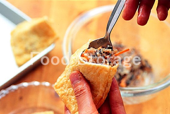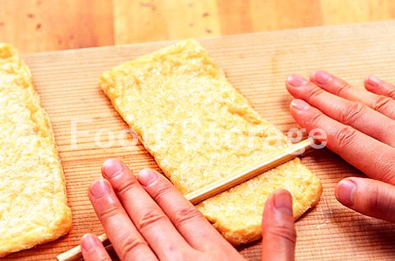 油揚げは熱湯を回しかけて油抜きし、水気をきってまな板の上にのせ、上から菜箸をころがして開きやすくする。半分に切って袋状に開く。 |