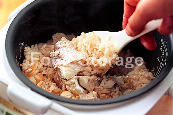 鯛の骨をはずして身をほぐし、ぬらしたしゃもじで底からごはん返すようにやさしく全体をよく混ぜる。器に盛って木の芽を飾る。 |