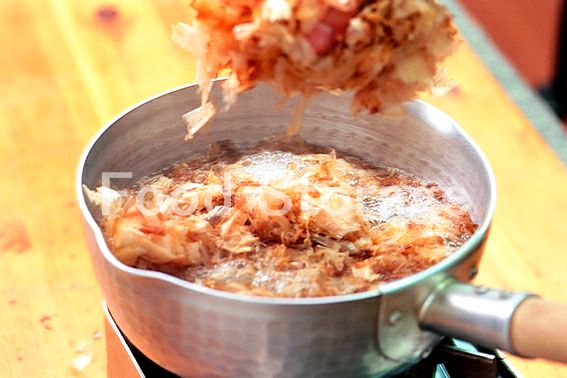 火を止める。4が再度煮立ったら、火を止め、削りかつおが沈むのを待つ。 |