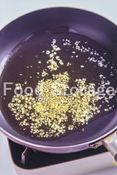 フライパンにオリーブ油、にんにくを入れて弱火にかけ、香りが出るまで熱する。 |