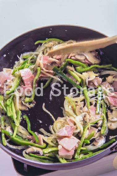 3に玉ねぎを加えて炒め、透き通ってきたら、マッシュルーム、ベーコン、ピーマンを加えて炒め合わせる。 |