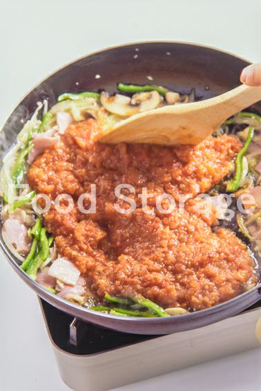 4にトマトソースを加えてさっと炒め合わせる。 |