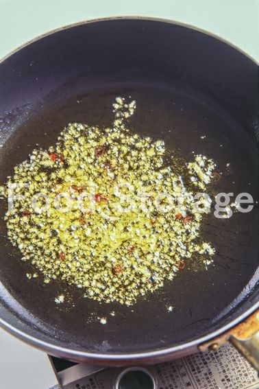 湯を沸かしてパスタをゆで始める。にんにくは皮をむいてみじん切りにする。赤唐辛子はヘタを落としてふり、中の種を取り除き、はさみで2mm幅の輪切りにする。 |