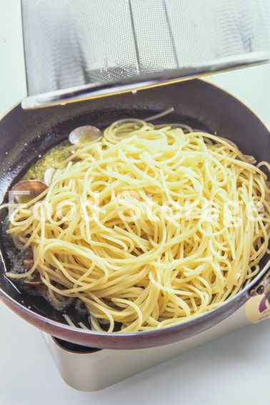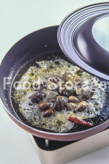 2にあさり、白ワインを加えてふたをし、アルコールが飛び、あさりの口が開くまで蒸す。 |