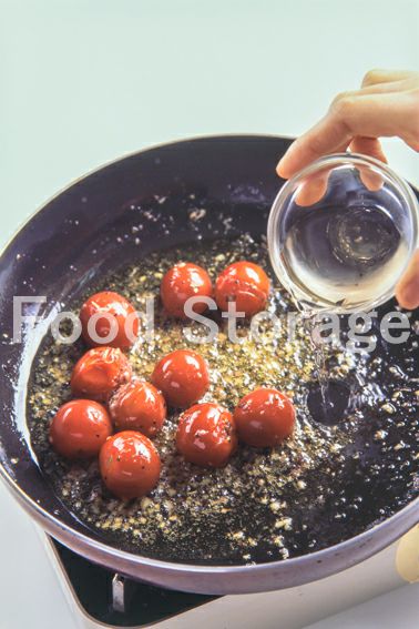 2にプチトマト、バジル、白ワインを加えてアルコールを飛ばす。 |