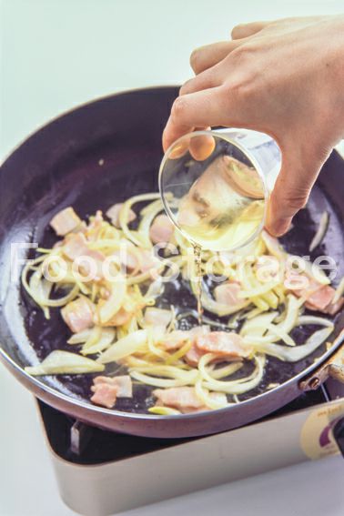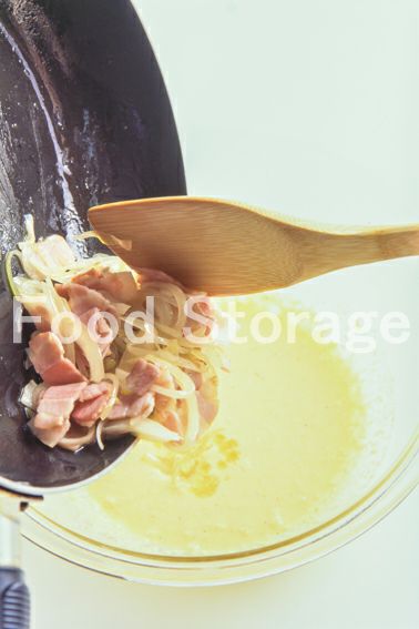 フライパンにオリーブ油を熱し、ベーコンを炒め、玉ねぎを加えてさっと炒め合わせる。 |