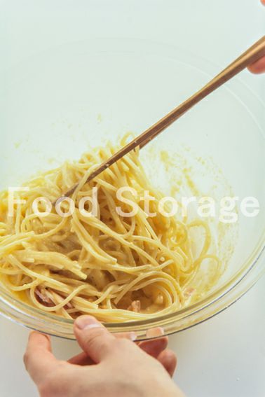 | 生クリームと粉チーズたっぷりのとろとろ卵のソースが魅力のメニュー。フライパンではなく、ボウルで絡めるのが、成功のコツ! |