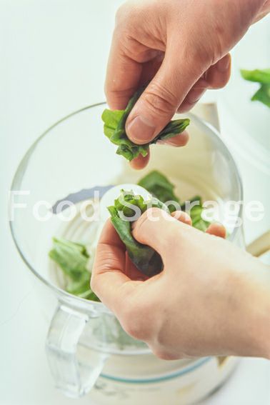 フードプロセッサーにバジルを手でちぎりながら入れる。 |