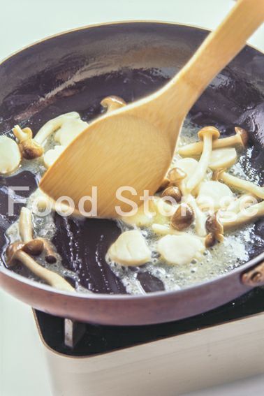 フライパンにバターを溶かし、ほたて、しめじを加えて炒め合わせる。 |