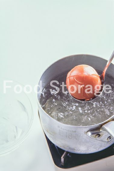 トマトは、湯むき(おしりに十字の切れ目を入れ、熱湯に浸けて氷水にとり、皮をむく)をする。 |