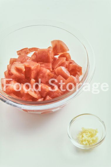 1のトマトは、種を取り除き、1.5cm角に切る。にんにくはみじん切りにする。 |