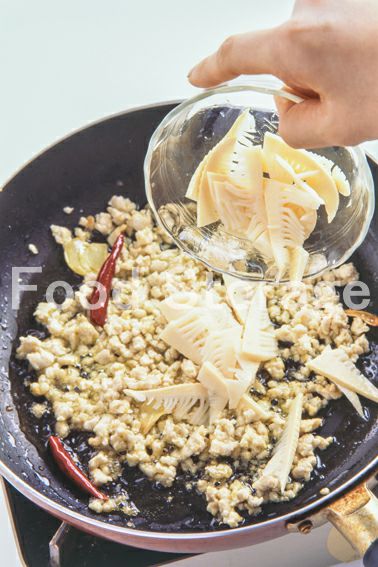 ひき肉の色が変わったら、たけのこを加えて炒め合わせる。 |