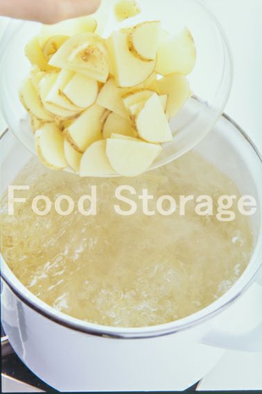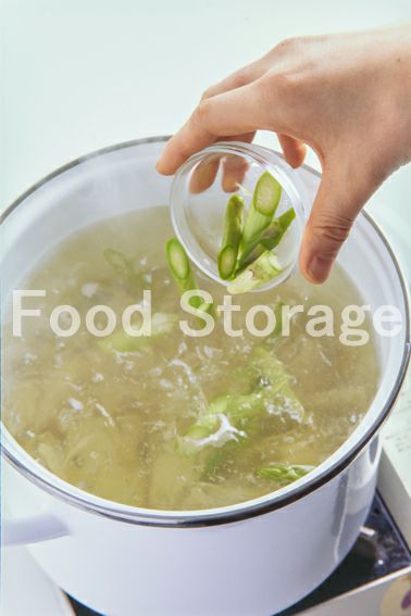 じゃがいもはよく洗い、皮付きのまま2〜3?厚さの半月切りにする。アスパラガスは根元を切り落とし、2cm幅のななめ切りにする。 |