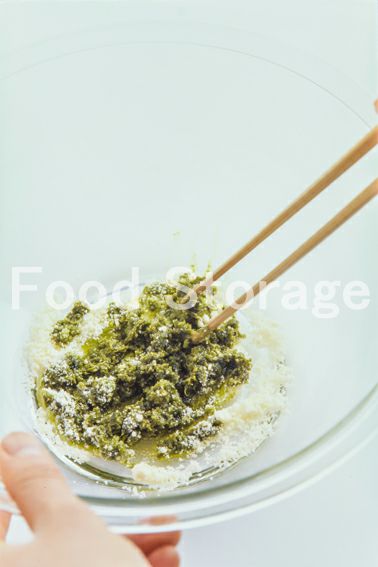 ボウルにバジルソース、粉チーズを入れ、混ぜ合わせる。 |