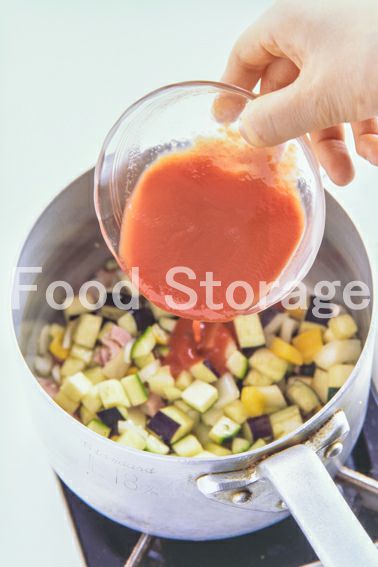 なす、ズッキーニ、種を除いたパプリカ、玉ねぎ、ベーコンは全て1cm角に切る。にんにくはみじん切りにする。プチトマトはヘタを取って4等分に切る。バジルは手でちぎる。 |