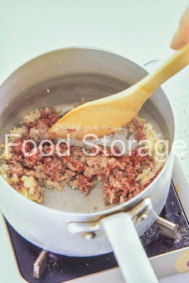 3の玉ねぎがしんなりしてたら、合いびき肉を加えて色が変わるまで炒める。