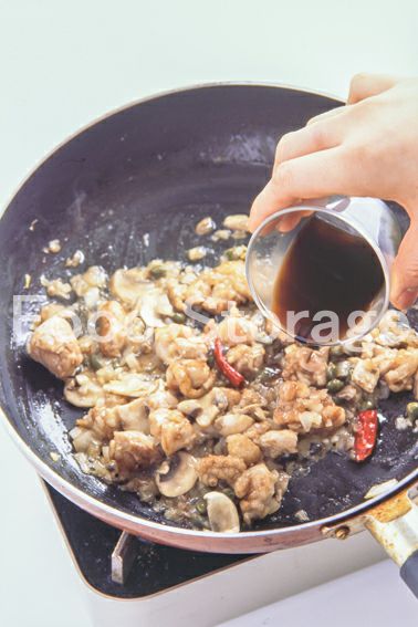 | 少し濃いめのバルサミコ酢としょうゆの味つけが、クセになるおいしさです。マッシュルームは、生を使って、歯ごたえを楽しみたい。 |