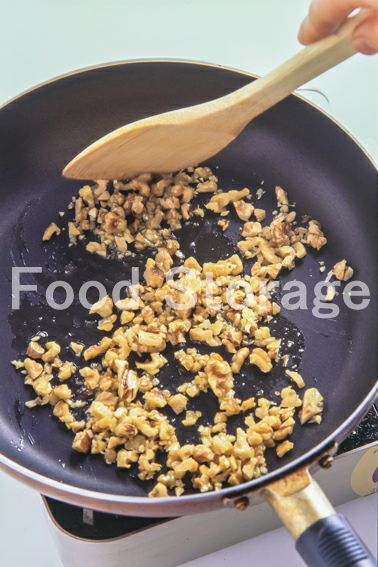 フライパンにオリーブ油、くるみ、にんにくを入れて弱火にかけ炒め合わせる。 |