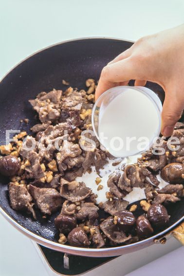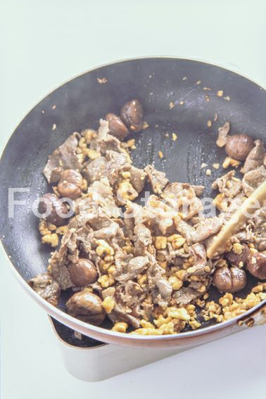 、にんにくの香りが出たら牛肉を加えて色が変わるまで炒め、甘栗を加えて炒め合わせる。 |