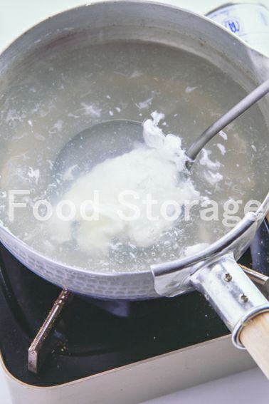 別の鍋に湯を沸かし、Aを加えて少し火を弱め、よく冷やした卵を割り入れて、お玉などで白身の形を整え、黄味が加熱されないうちに引き上げる。 |