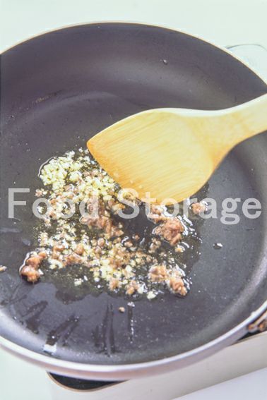 フライパンにオリーブ油、アンチョビー、にんにくを入れて弱火にかけ、にんにくの香りが出るまで熱する。 |