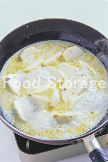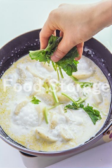 5のかぶがやわらかくなったら、生クリーム、かぶの葉を加えてさっと煮る。 |