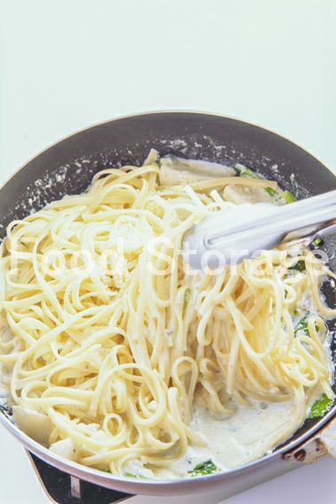 湯が沸いたら、塩大さじ2(分量外)を加え、パスタを加えてゆで始める。 |