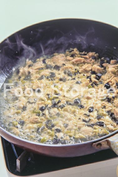 3にオリーブ、缶汁を切ったツナ、白ワインを加えて強火で煮立て、アルコールを飛ばす。 |