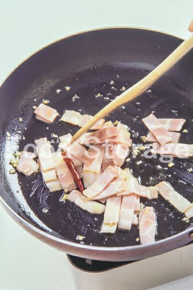 フライパンにオリーブ油、にんにく、赤唐辛子を入れて熱し、ベーコンを入れて炒め合わせる。 |