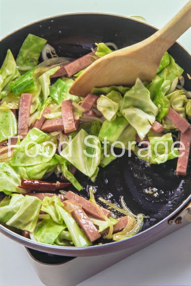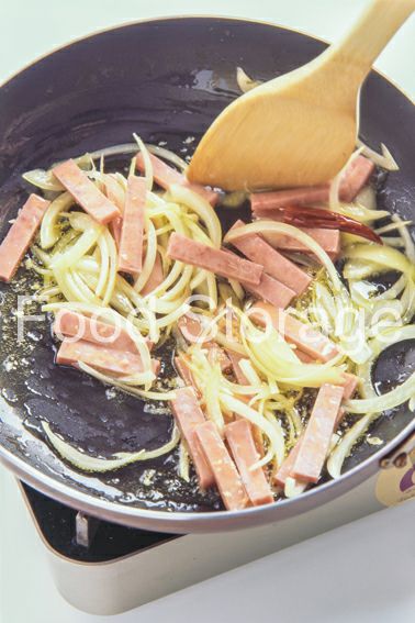 4に玉ねぎ、スパムハムを加えて炒め合わせる。 |