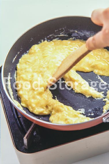3のフライパンにオリーブ油を加えて熱し、Aを加えて弱火にかけ、木べらでゆっくりとかき混ぜながらスクランブルエッグを作る。 |