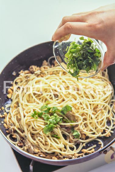 鍋にたっぷりのパスタをゆでる湯を沸かし始める。オイルサーディンは軽くほぐす。ピーナッツは熱湯で茹でて粗めに砕く。クレソンは粗みじん切りにする。にんにくはみじん切りにする。 |