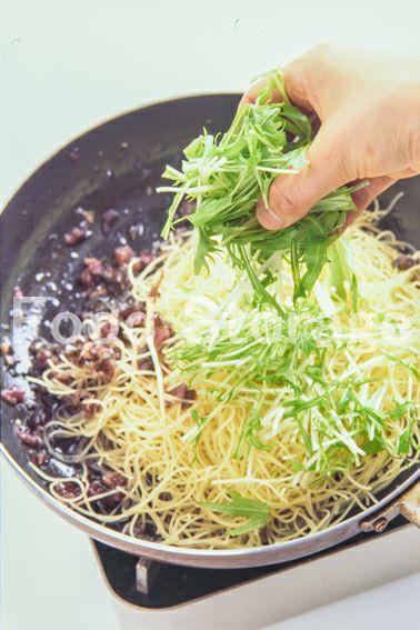 4がふつふつと沸いてきたらゆで上がって水けをきったパスタ、ざく切りにした水菜を加えてさっとからめ、塩、こしょうで調味する。 |
