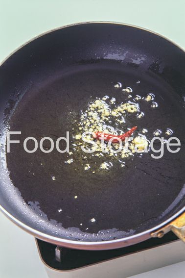 フライパンにオリーブ油、にんにく、赤唐辛子を入れて火にかけ香りが出てくるまで熱する。 |