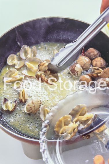 5のあさりの口が開いたら、あさりを取り出しておく。汁は残す。 |