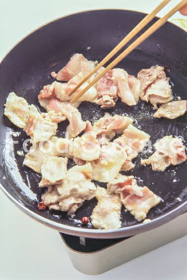 3に豚肉を入れ、こんがりと焼いて塩、こしょう、酒をふる。 |