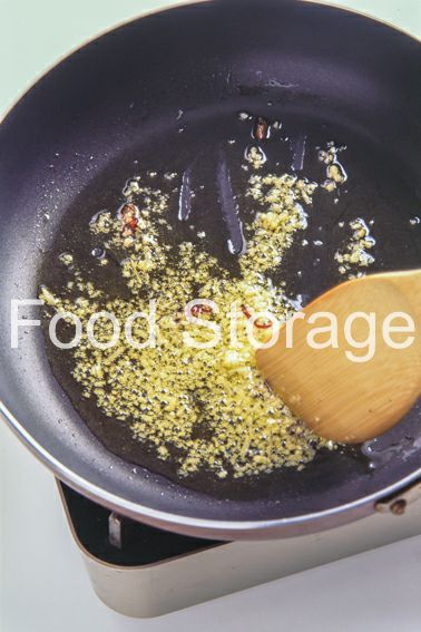 フライパンに、しょうが、にんにく、赤唐辛子、オリーブ油を入れて弱火にかけ、香りが出るまで熱する。 |