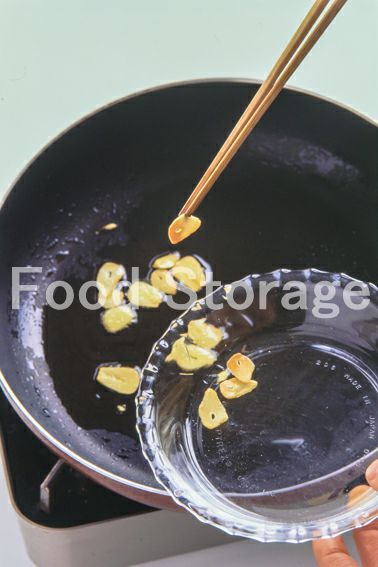 フライパンにオリーブ油とにんにくを入れ、弱火にかけてにんにくがきつね色になったら取り出す。 |