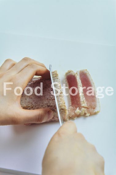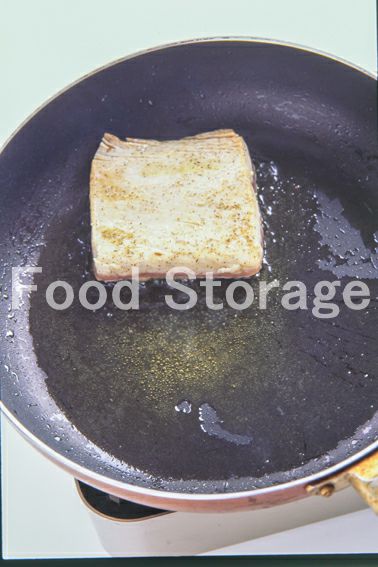 2のフライパンにまぐろを入れ、表面をさっと焼きつけて取り出す。 |