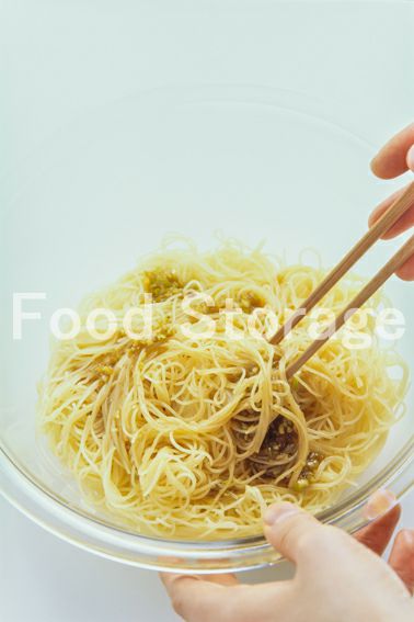 パスタがゆで上がったら冷水に取って、水けをきり、ボウルに入れ、Bと長ねぎの芯を合わせたもの、4のゆで汁を加えて混ぜ合わせ器に盛る。5のまぐろ、2で取り出したにんにくと白髪ねぎをのせる。 |