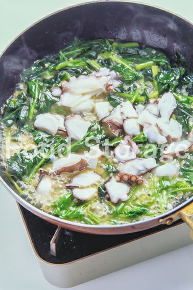 4のほうれん草がしんなりしたら、ゆでだこ、A、パスタのゆで汁を加えて沸騰させる。 |