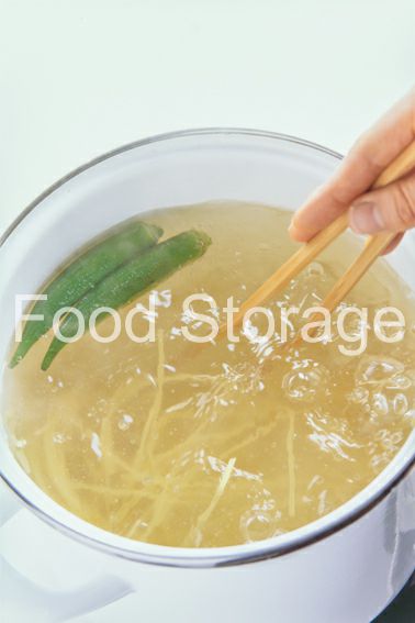 5のフライパンに、赤唐辛子、オクラ、ゆで上がって水けをきったパスタ、ゆで汁を加えて混ぜ合わせ、しょうゆ、塩、こしょうで調味する。 |