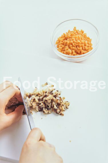 鍋にたっぷりのパスタをゆでる湯を沸かし始める。干ししいたけは水に浸して戻し、軸を取ってみじん切りにする。にんじん、長ねぎ、にんにく、しょうがは、みじん切りにする。 |