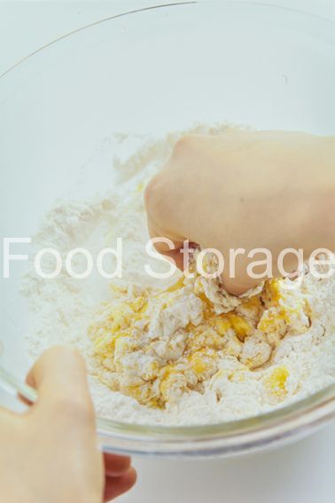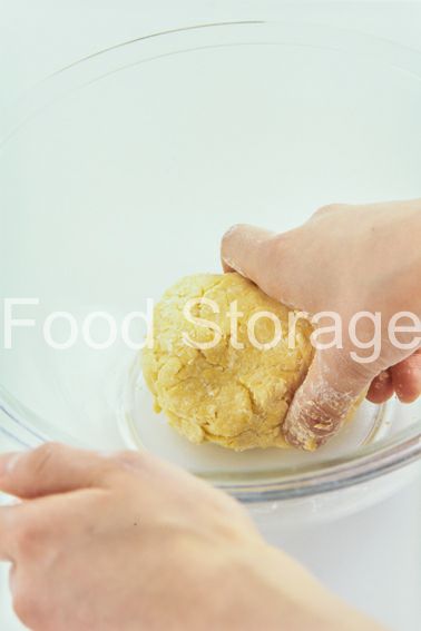 ボウルの中で完全に材料がひとまとまりになったら、ボウルから台の上に出す。 |
