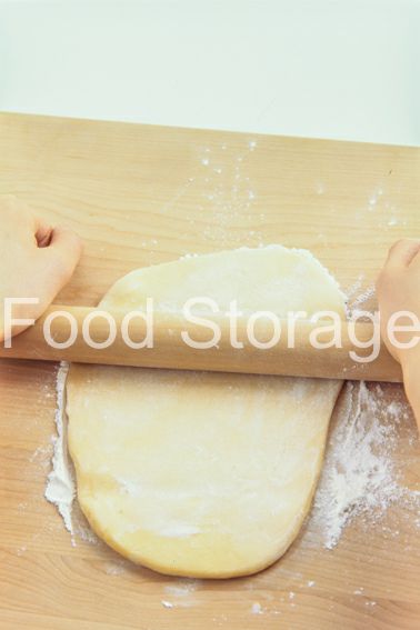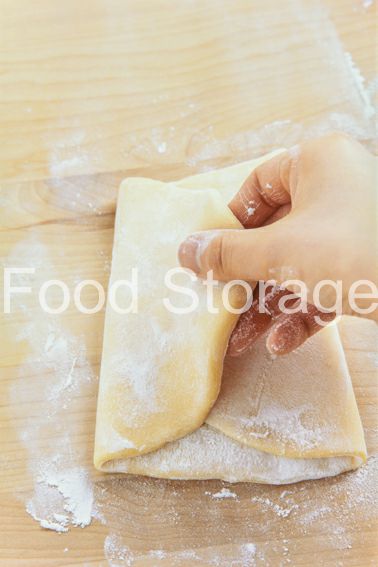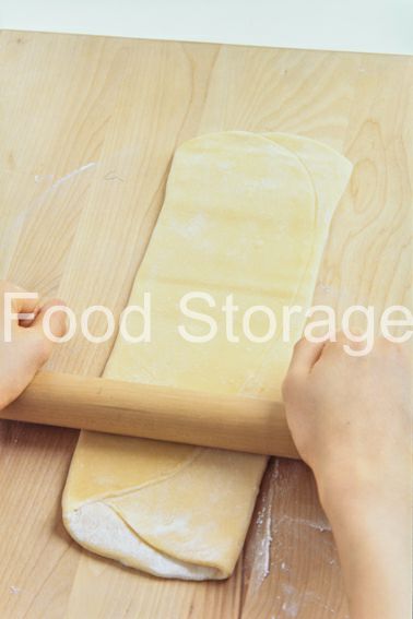 台の上の打ち粉(分量外)をし、生地を中心から外側に向かって長方形にめん棒でのばす。※打ち粉は強力粉と薄力粉どちらでもよい。 |