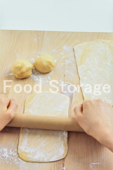 【基本の手作りパスタ生地】は4等分にし、打ち粉をした台で1つずつを10cm×15cm大にのばす。端を包丁で切ってきれいな長方形にする。 |
