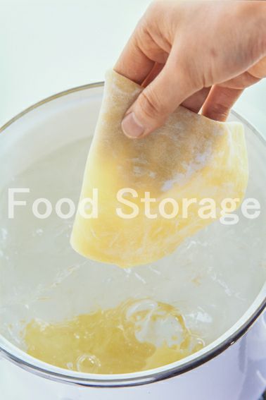 湯が沸いたら、塩大さじ2(分量外)を加え、1のパスタをゆっくりと1枚ずつ入れ、はしでゆっくりかき混ぜながら約2分ほどゆで、1枚ずつ水に取って冷めたら水けをふき取る。 |