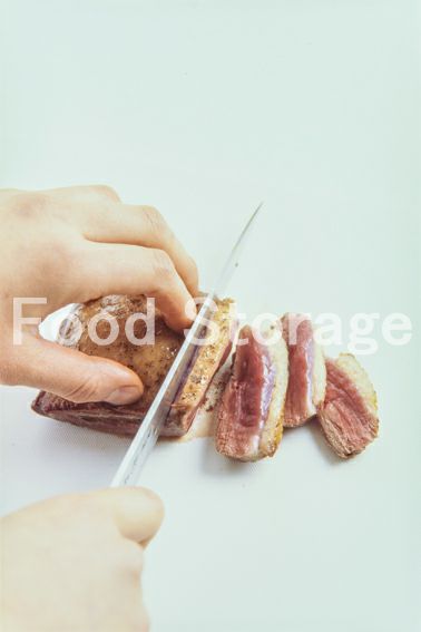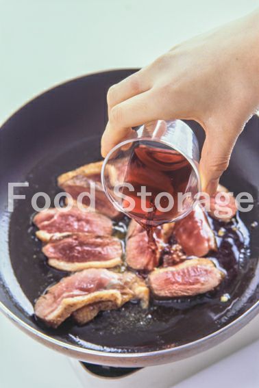 フライパンにオリーブ油大さじ1を熱し、鴨肉をこんがりと焼く。 |