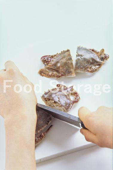 パスタをゆでる湯を沸かし始める。わたりがには足の部分を切り落とし、体を食べやすい大きさに切り分ける。にんにくは包丁でつぶす。 |