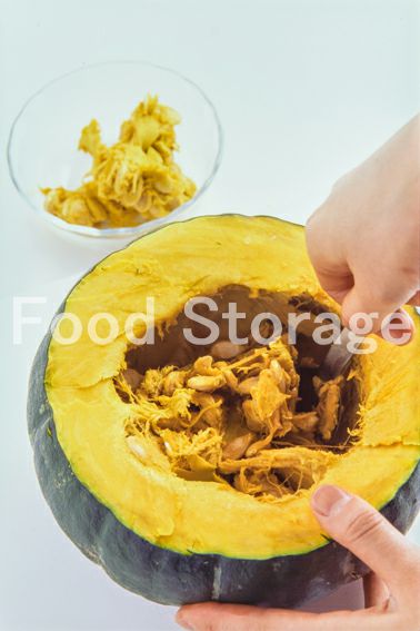 2のかぼちゃを皮から1cm厚さを残して包丁で切れ目を入れ、中をくり抜き、とっておく。 |